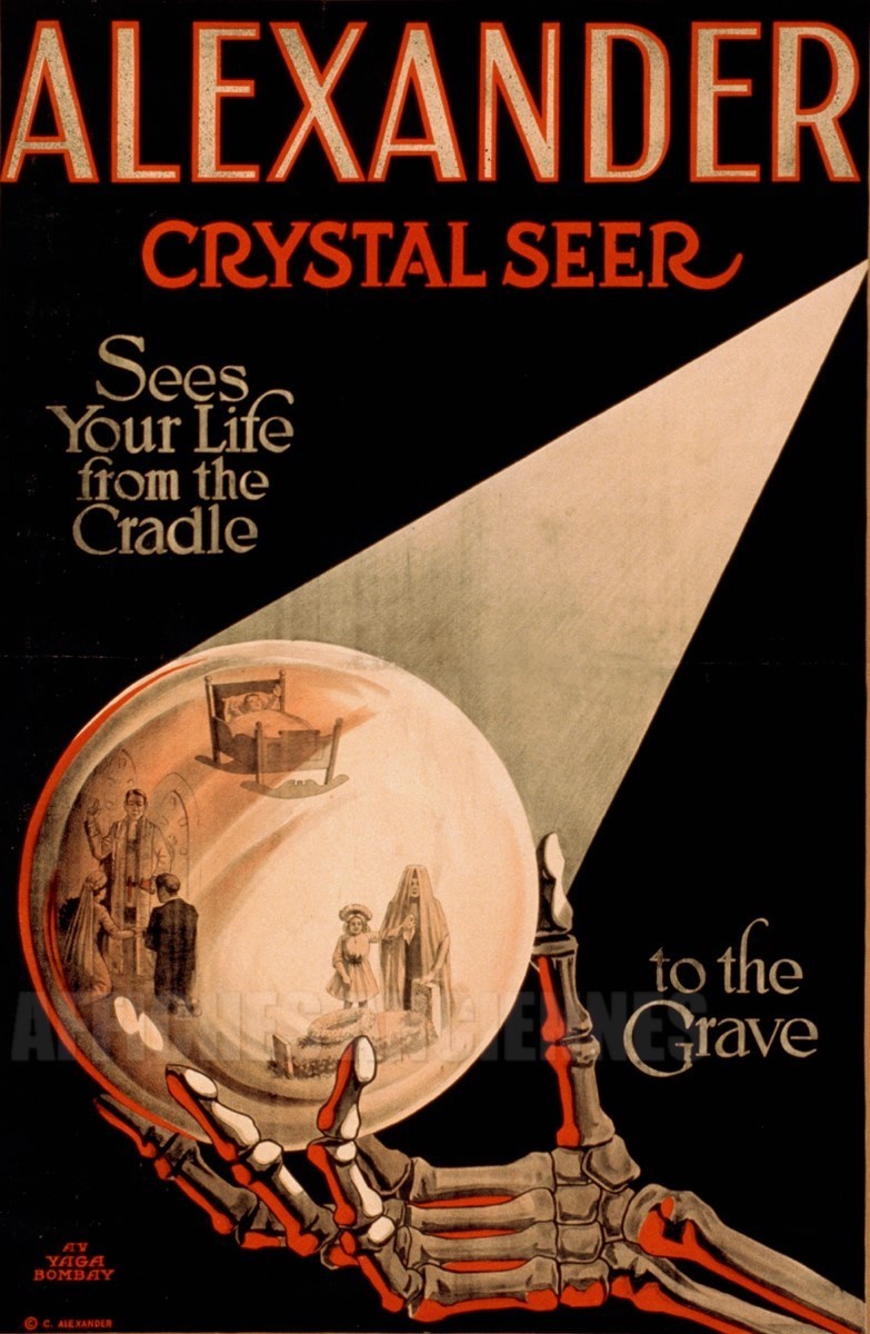 REPRODUCTION AFFICHE ANCIENNE SUR LA MAGIE LE MAGICIEN ALEXANDER, DANS SA BOULE DE CRISTAL, VOTRE VIE DU BERCEAU A LA TOMBE