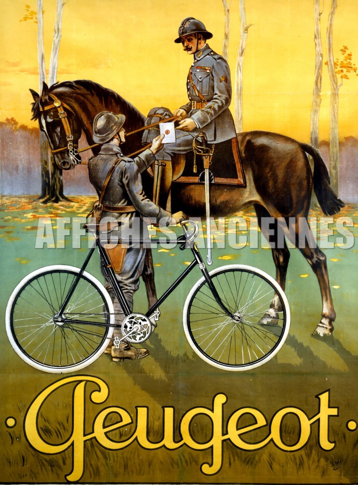 reproduction affiche ancienne peugeot velo cycles bicyclette cheval et cavalier