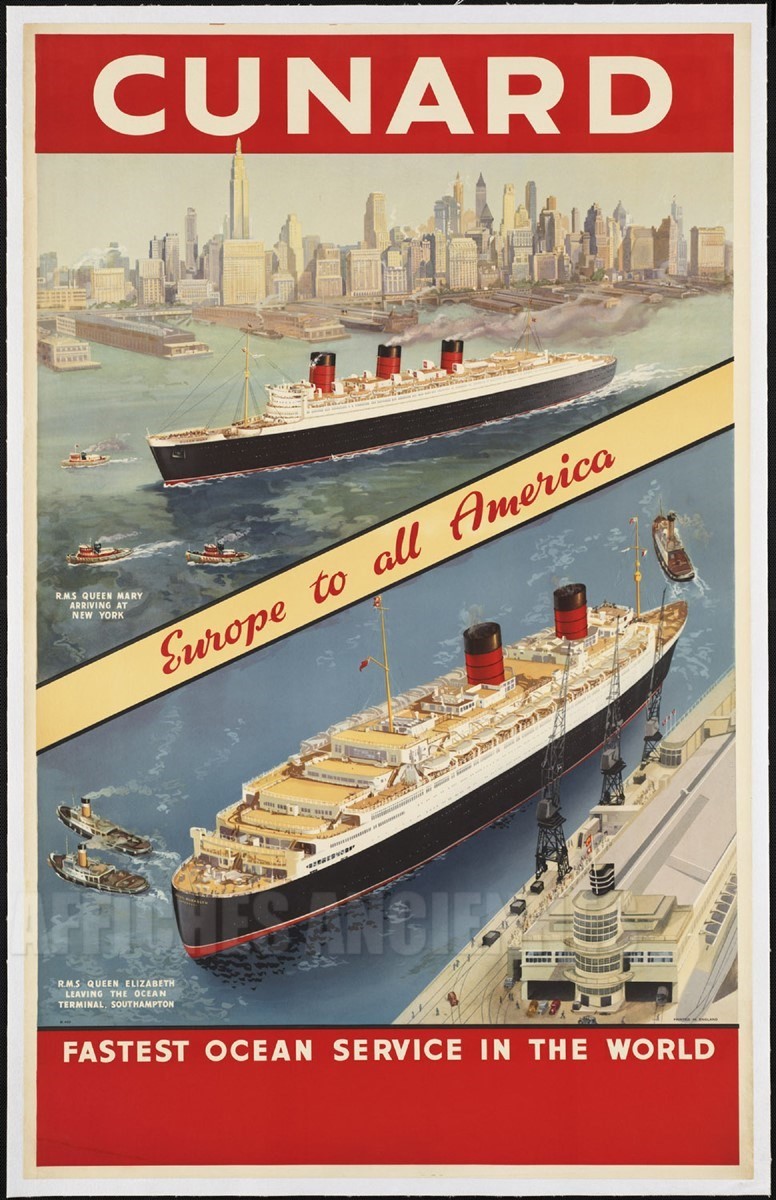 AFFICHE CUNARD LINE EUROPE TO AMERICA NEW YORK PAQUEBOT QUEEN ELISABETH SOUTHAMPTON