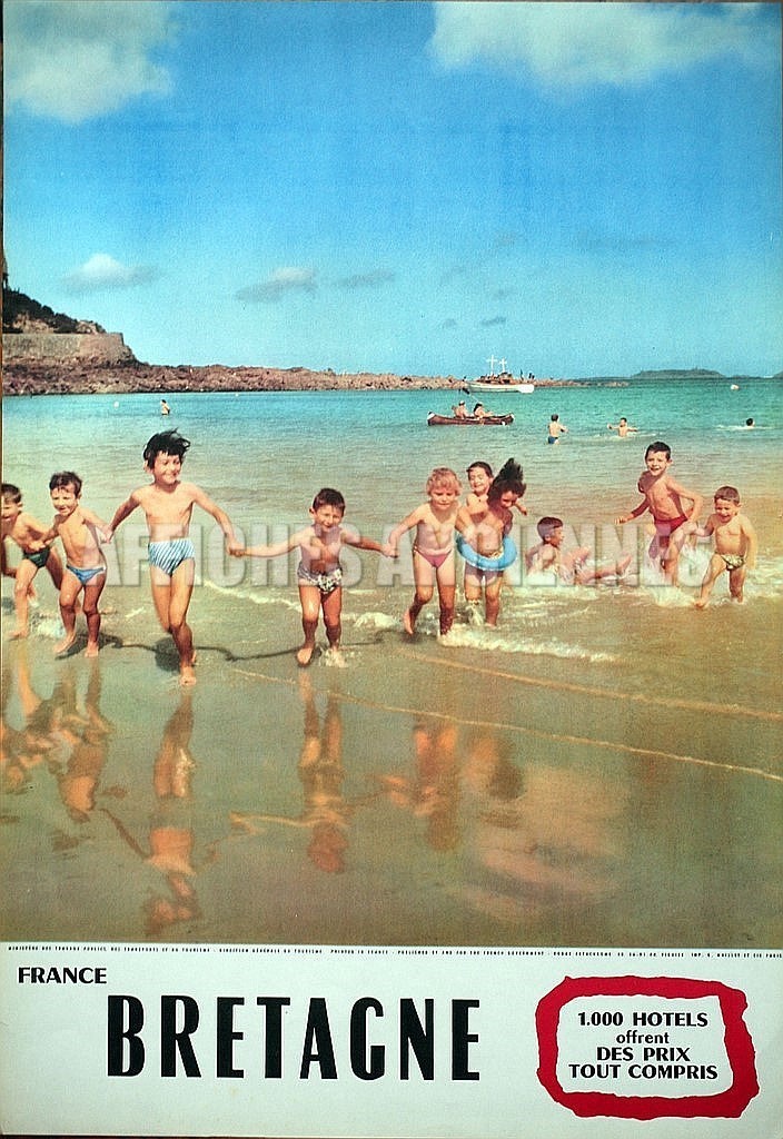 FRANCE BRETAGNE ENFANTS SUR LA PLAGE VOILIERS ET CANOE AFFICHE ORIGINALE FORMAT 40X60 CM CIRCA 1960