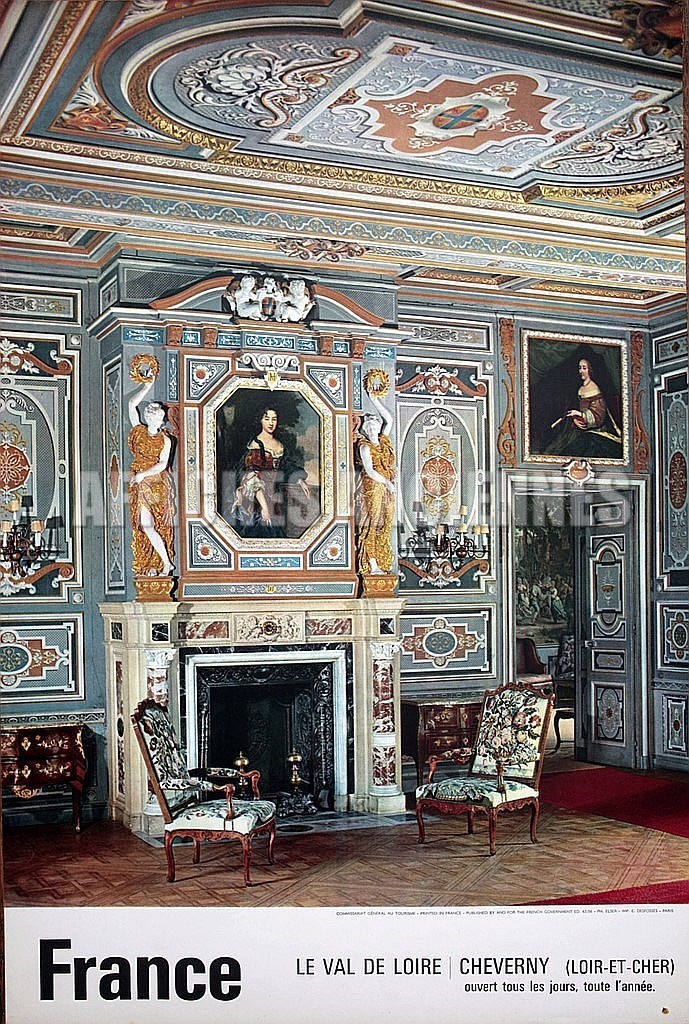 FRANCE LE CHATEAU DE CHEVERNY VAL DE LOIRE MOBILIER AFFICHE ORIGINALE FORMAT 40X60 CM CIRCA 1960