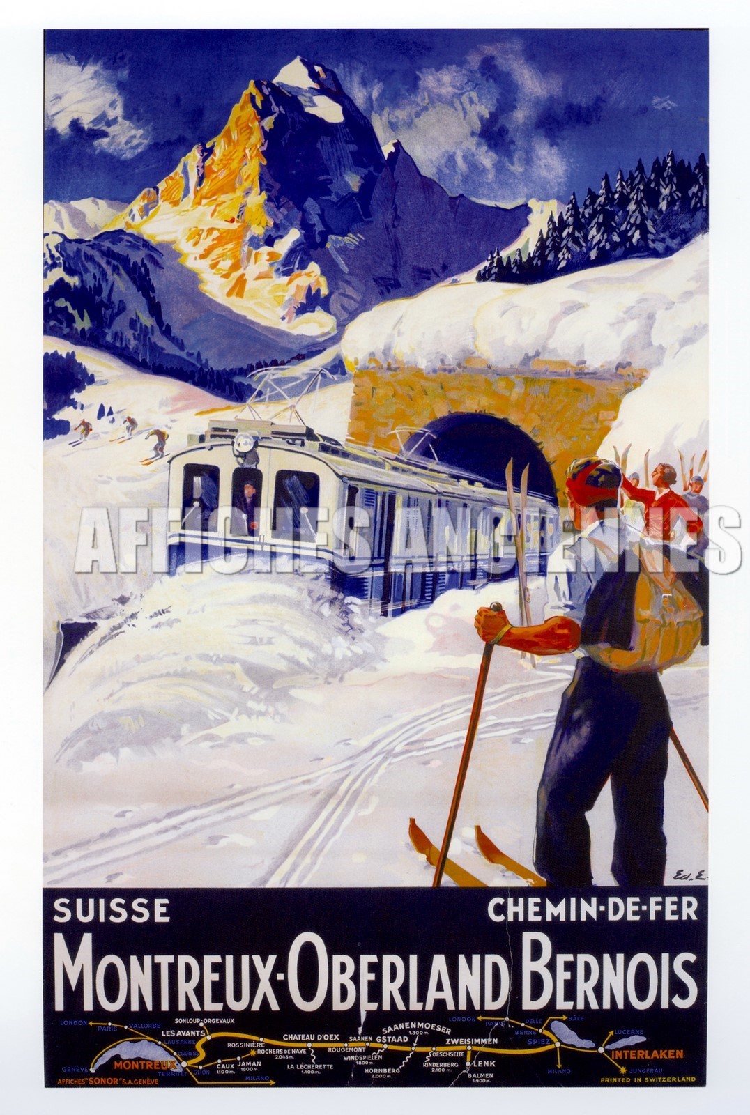 reproduction affiche ancienne chemin de fer suisse ski montreux oberland bernois