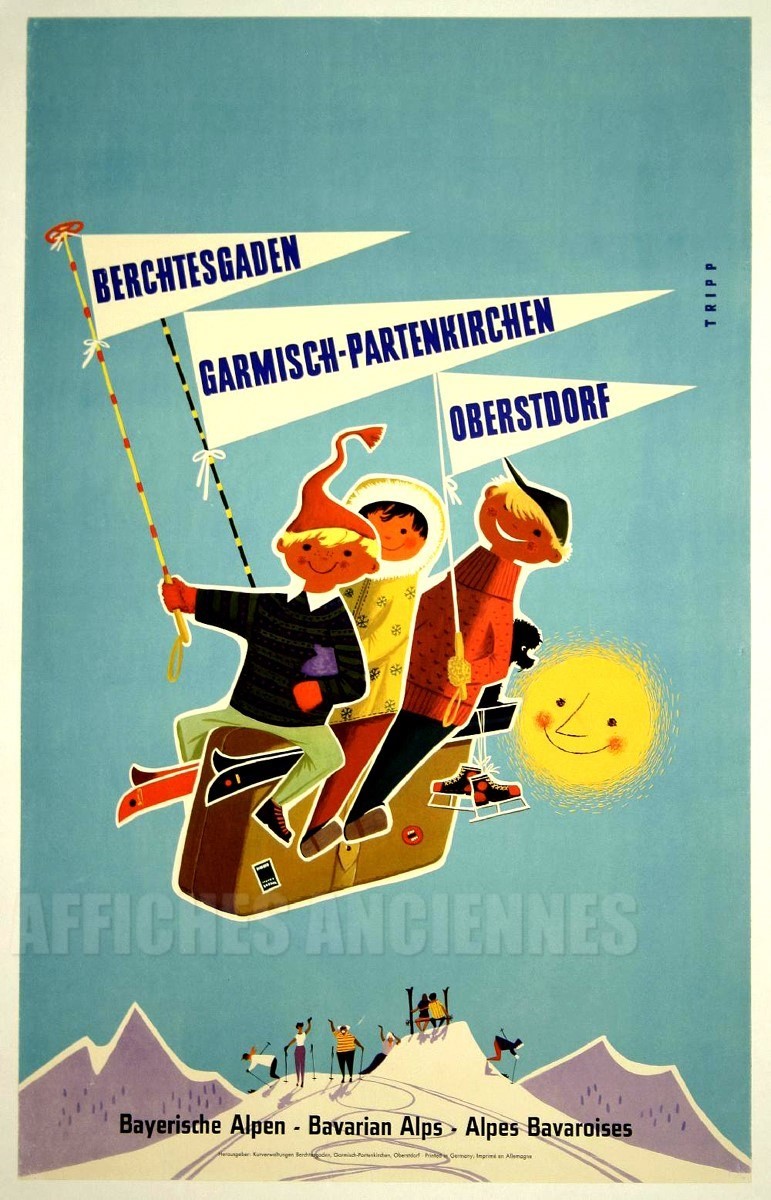 reproduction affiche ancienne SKI A BERCHTESGADEN GARMICSH OBERSTDORF ALPES BAVAROISES